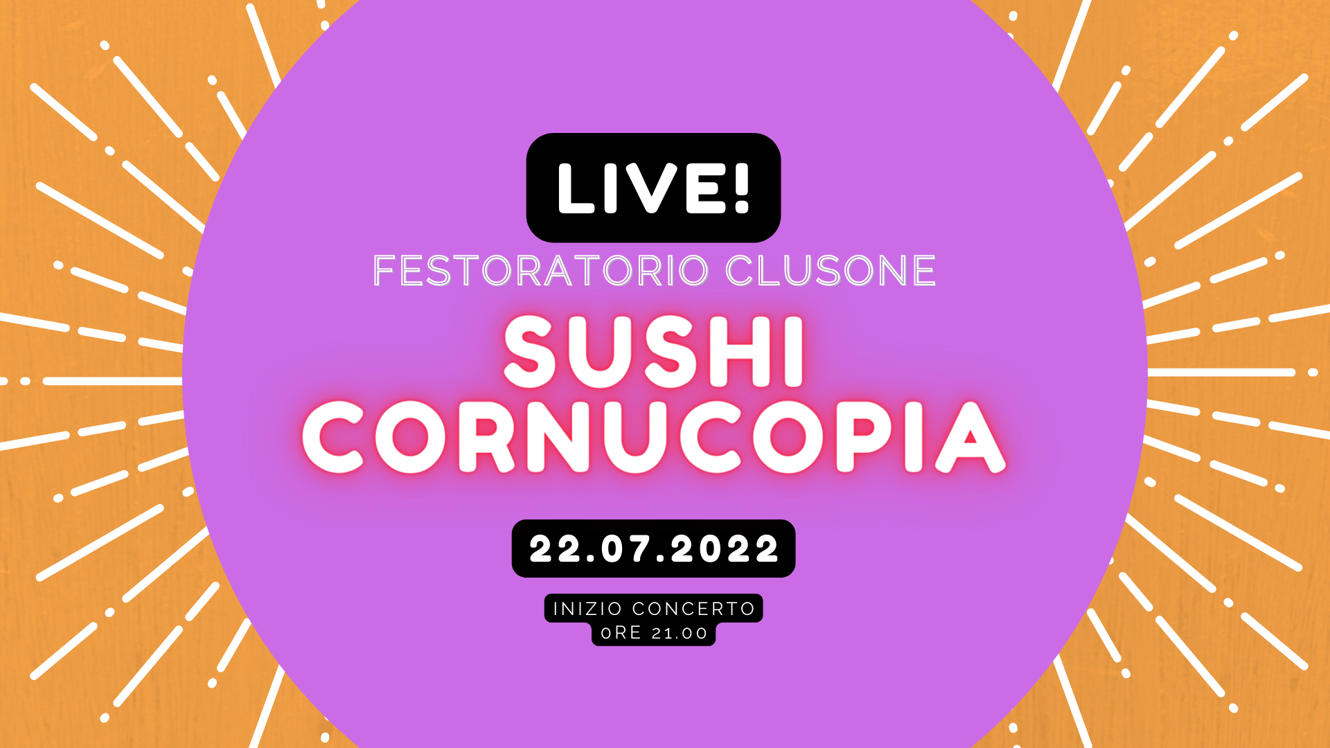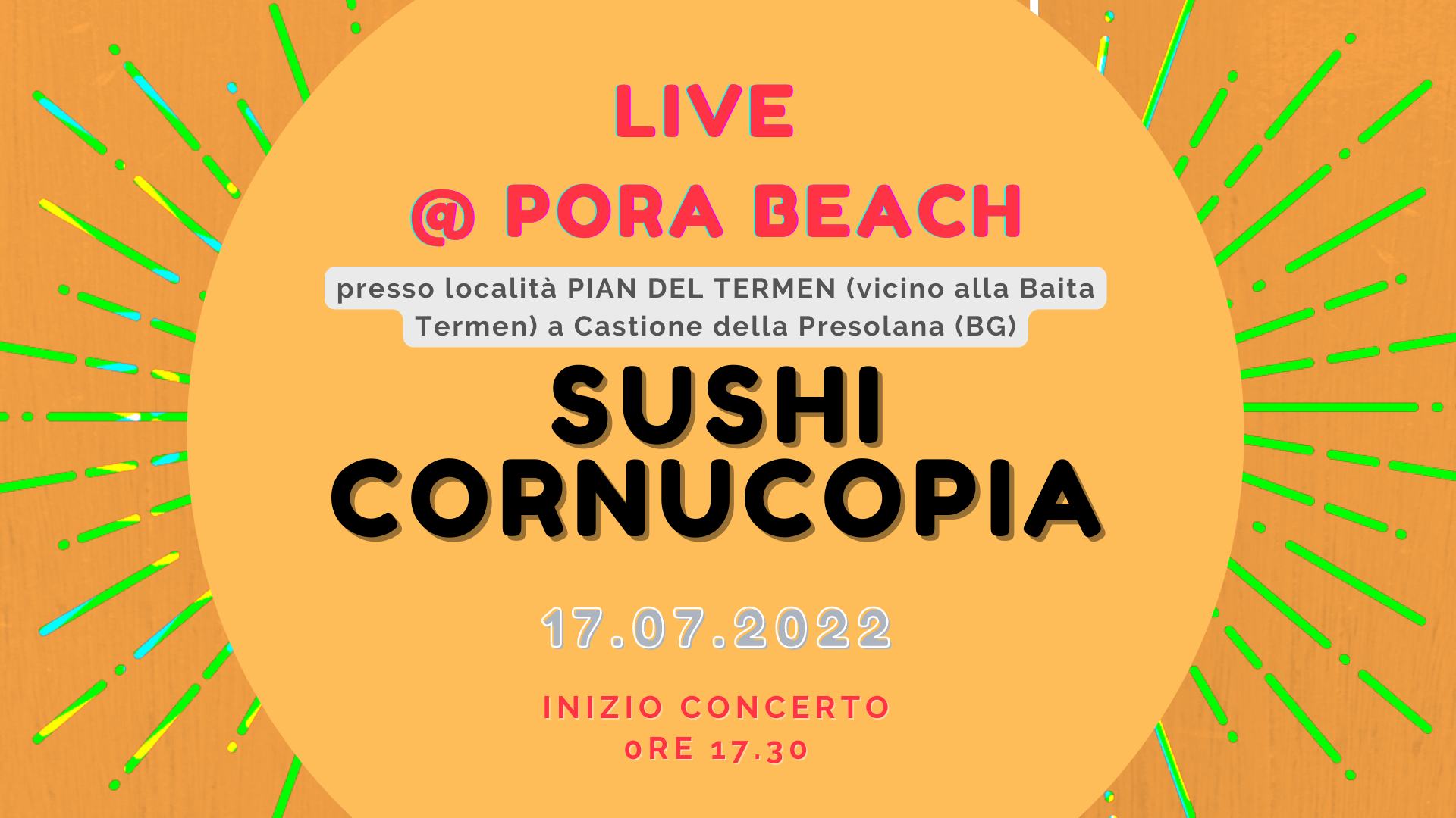Data live dei Sushi Cornucopia: 17 luglio 2022, presso il PORA BEACH nei pressi della Baita del Termen, Monte Pora.